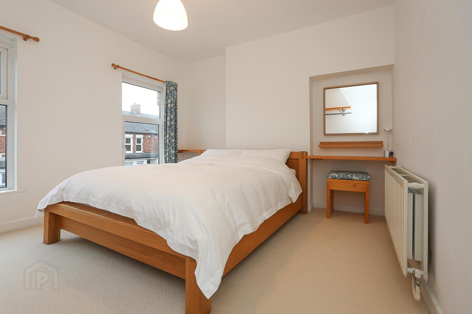 Bedroom 2: 10’ 10” x 7’ 7” Fawn carpet, radiator, centre light, hanging rail shelf.