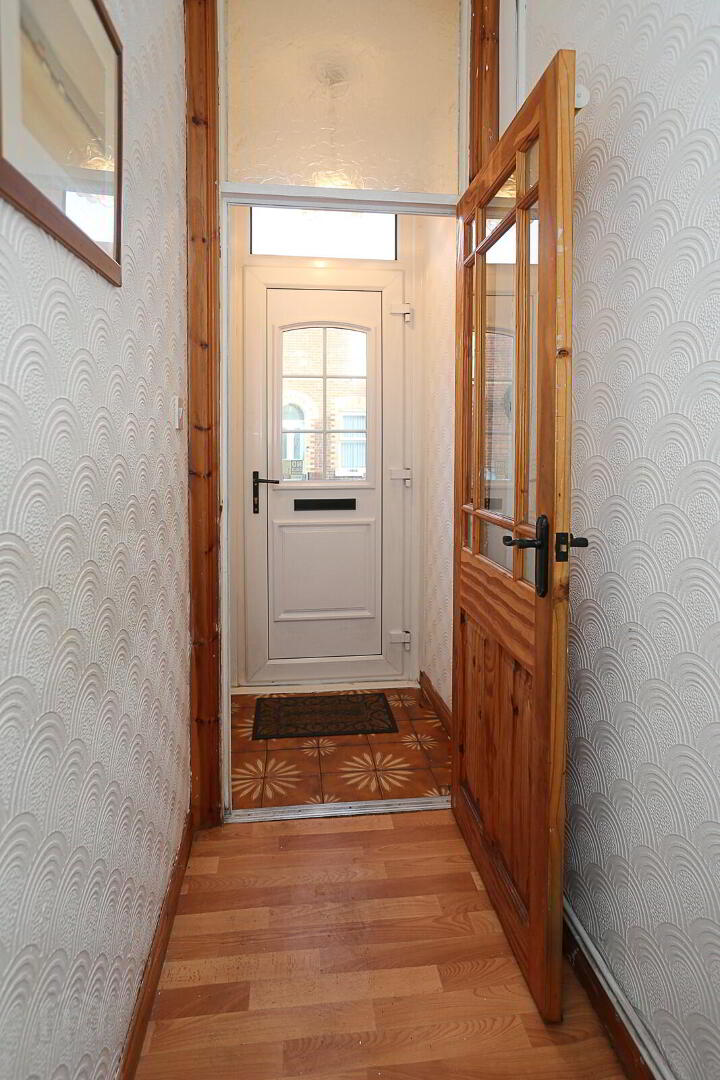 Entrance: Hallway with inner porch and PVC front door, wood laminate flooring, double panel radiator.