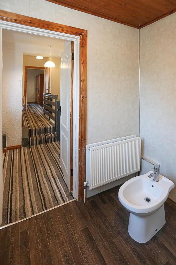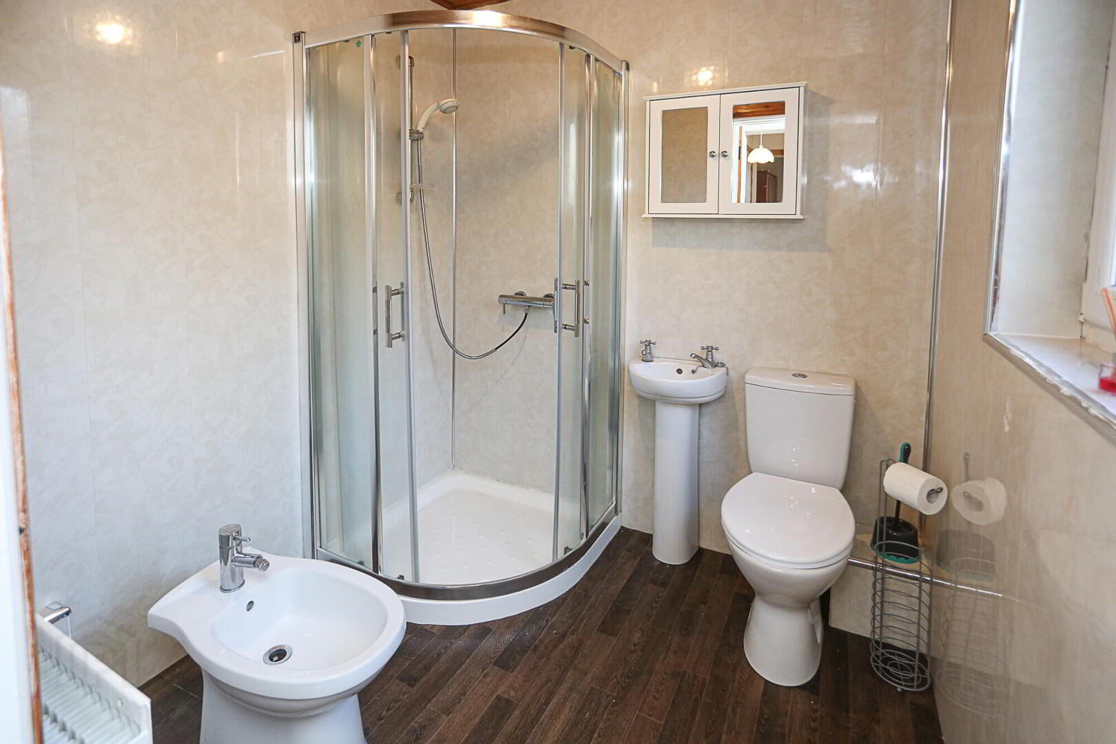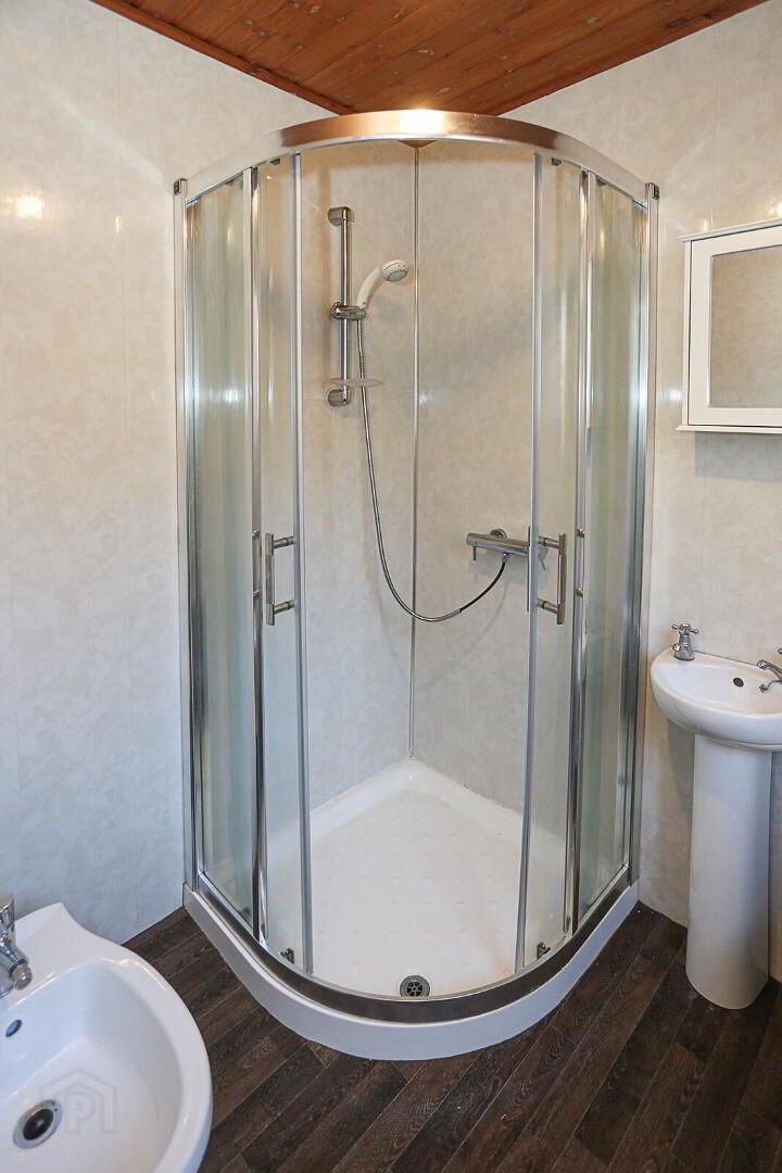 Shower-room: 6’ 3” x 6’ 3” PVC wall panels and pine ceiling, corner shower cubicle with thermostatic shower, low flush wc, pedestal wash hand basin, bidet, vinyl flooring, radiator.