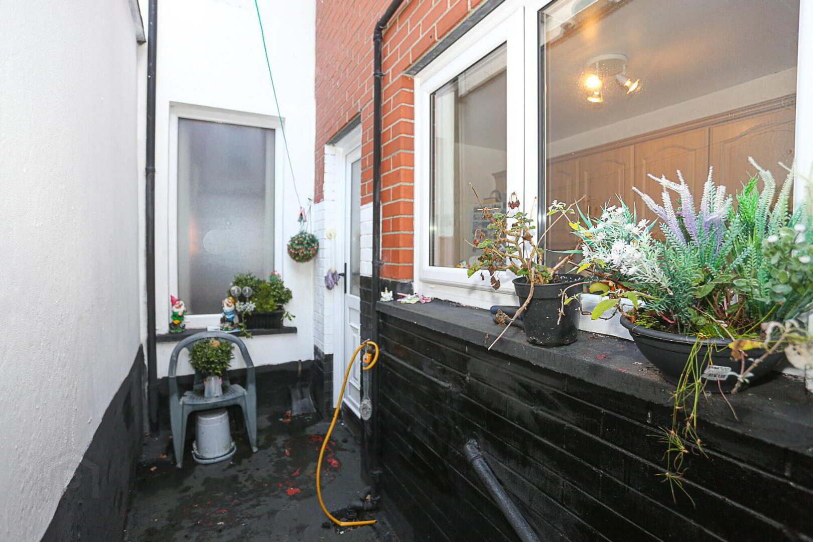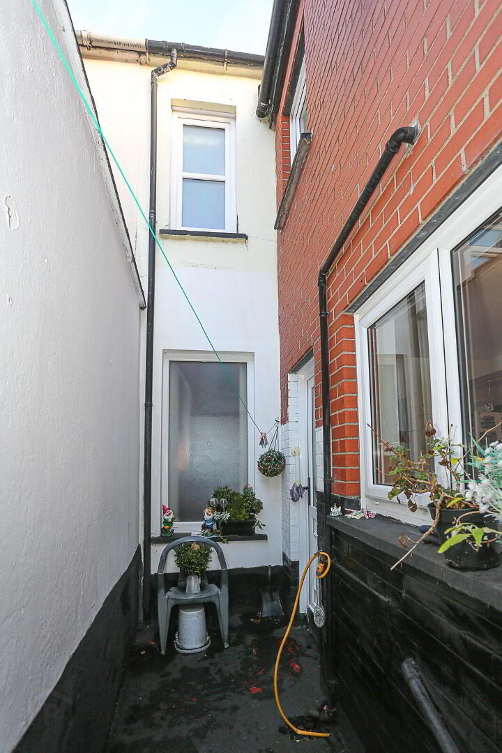 Outside: Rear yard with access to alley for bins, outside tap, forecourt at front with wrought iron gate and fence.