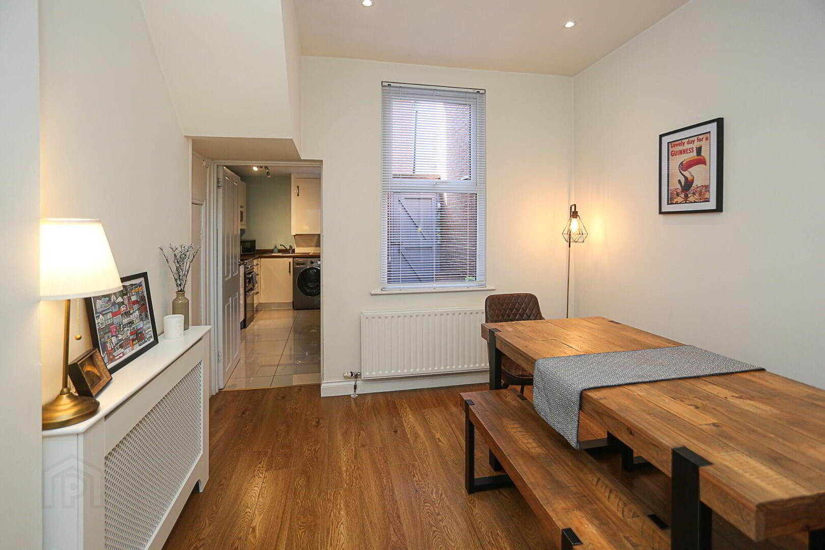 Lounge: 22’ x 10’ (at widest point) Laminate wood flooring, feature fireplace, recessed spots, cloaks understairs, dining area, 2 radiators.