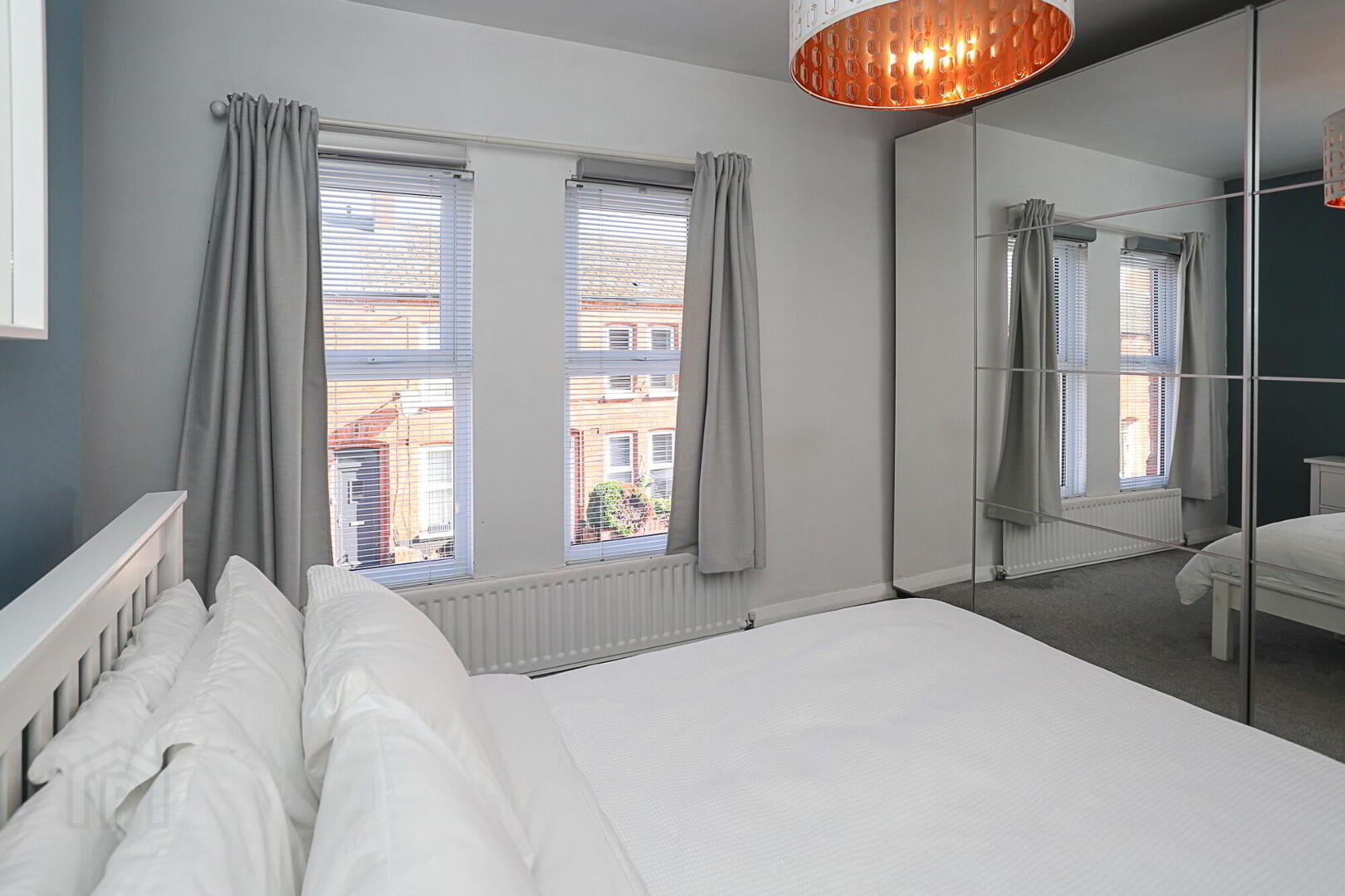 Bedroom 1: 13’ 1” x 10’ 4” Grey carpet, range of mirrored slide robes, radiator.