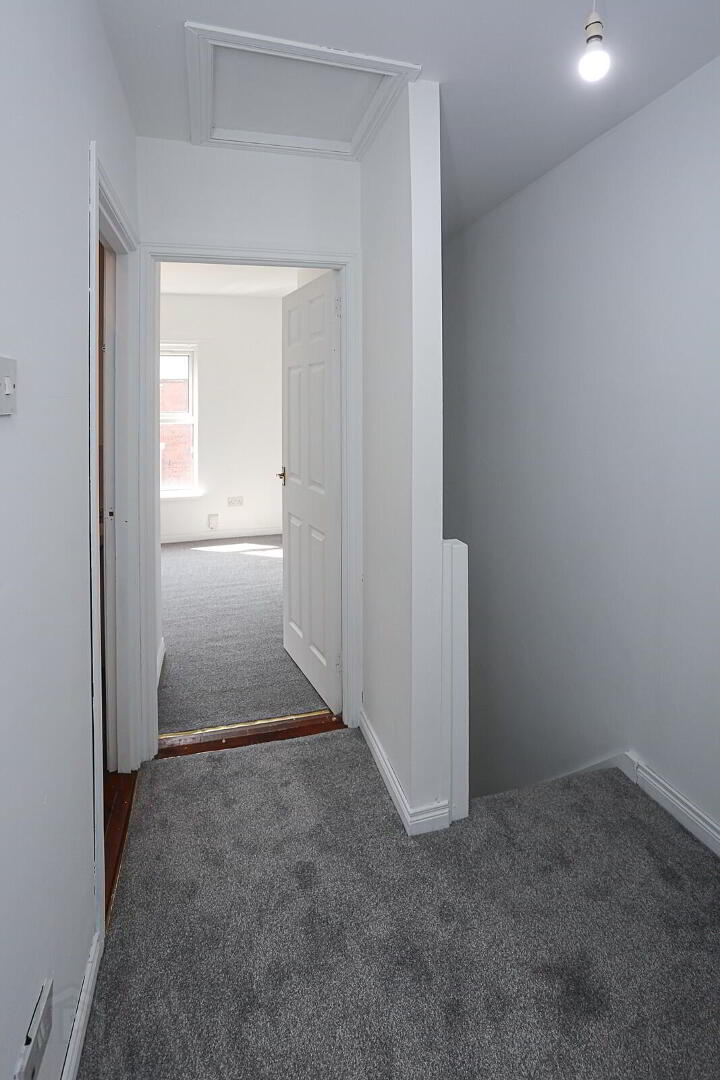 Stairs and Landing: New grey carpeting, new decor, linen closet.