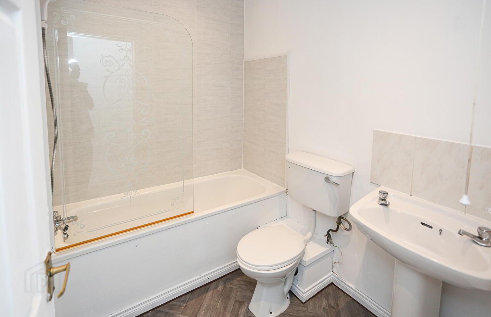 Bathroom: Panel bath with shower over, glass shower screen, pedestal wash hand basin, low flush wc, radiator, extractor fan, new vinyl flooring, PVC panelling.