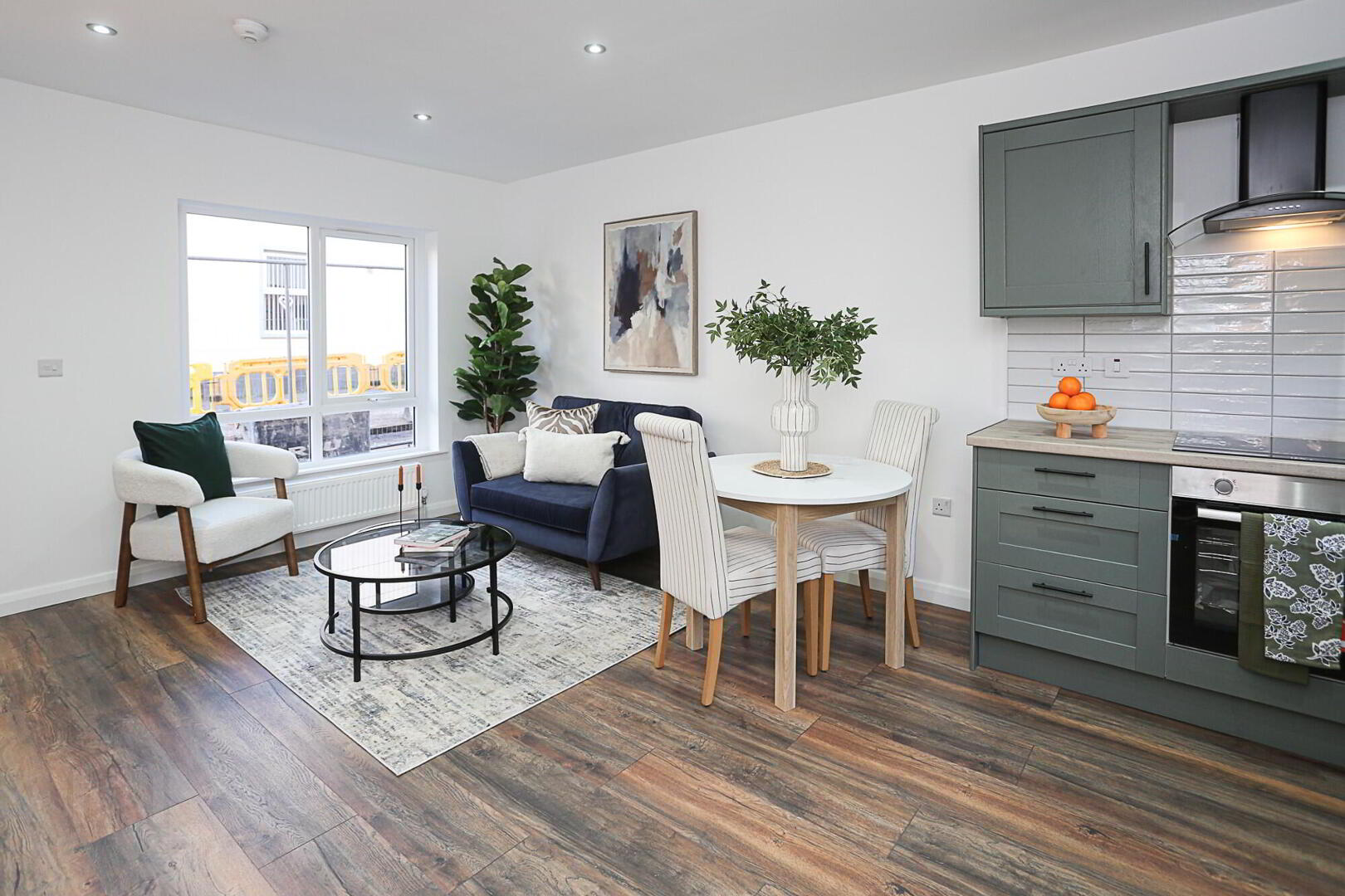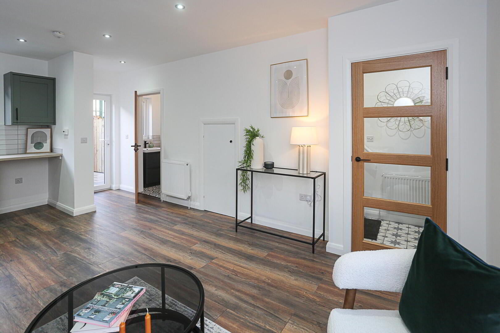 Lounge & open plan Kitchen: 19’ x 13’5” Wood laminate flooring, storage understairs, modern fitted sage Shaker kitchen with black accent handles, black ceramic sink with mixer taps, built in oven and ceramic hob, black extractor hood, plumbed for washing machine, space for fridge freezer, tiled splash backs.
