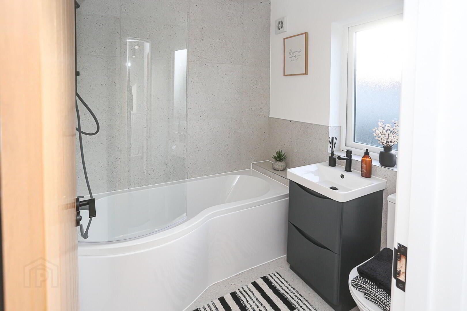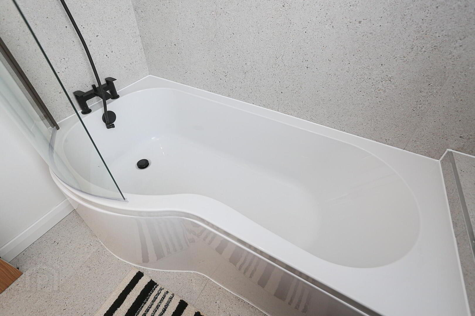 Bathroom: 6’ 11” x 6’ 3” New luxury bathroom with panel p-shaped bath, glass shower screen, rainfall shower, vanity sink unit, low flush wc, black hot towel rail, tiled floor and part tiled walls, extractor fan.
